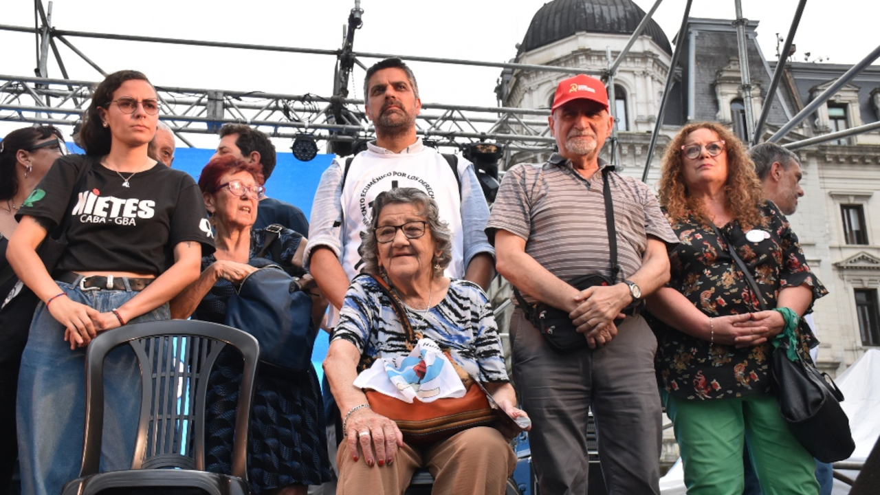 “Con los Pañuelos Blancos como bandera” y “con lxs 30.000 presentes”, los organismos de DDHH junto a diversas organizaciones sociales, sindicales y políticas entre las que estuvo el Partido Comunista, se sumaron a la Ronda de las Madres en una tarde en la que se le hizo un reconocimiento especial a la lucha que llevan adelante lxs jubiladxs, con participación de Claudio Cabrera por el Movimiento de Jubiladxs Liberación. También hubo charlas temáticas sobre la reforma laboral y la violencia institucional, un “camarazo” para exigir justicia por Pablo Grillo, manifestaciones de solidaridad con lxs presxs políticxs y con los pueblos de Venezuela y Palestina, recitales y una feria de la economía popular. Entre las varias personalidades de la política y los Derechos Humanos que asistieron a la jornada, sobre el escenario estuvieron el Secretario General del Partido Comunista, Jorge Kreyness, y la Presidenta de la Liga Argentina por los Derechos Humanos, Iris Pereyra de Avellaneda. Mientras que las palabras de cierre estuvieron a cargo de Estela de Carlotto, Taty Almeida y Adolfo Pérez Esquivel.