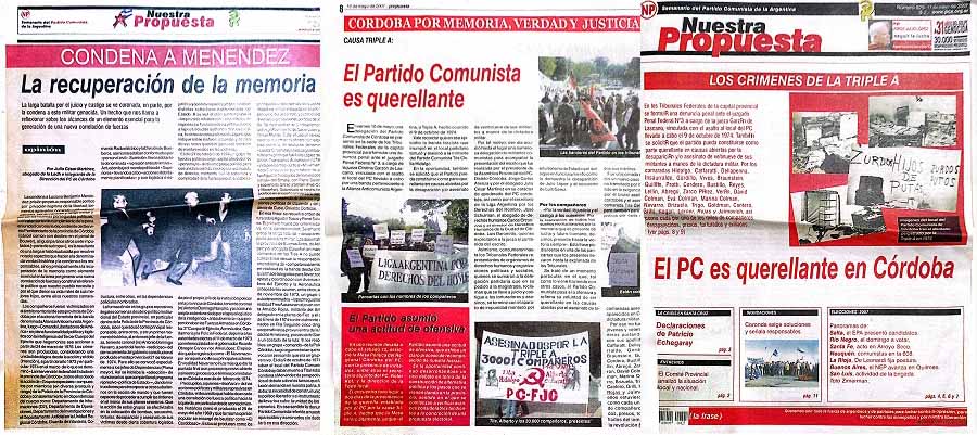 Es de rescatar de la nota “El PC es querellante en Córdoba ” publicada en tapa de “Nuestra Propuesta” el 15 de mayo de 2007 se afirmaba lo siguiente: “El sentido político que da la existencia del Partido Comunista como parte de la producción histórica que nuestro pueblo realizó a lo largo de la lucha de clases en Argentina, exige el protagonismo directo en aquellos escenarios que se instalan con mucha fuerza; propicios a la hora de aportar, no solo al esclarecimiento de los hechos, sino al debate profundo, necesario, reivindicativo y potenciador, cuando se piensa en la revolución”.