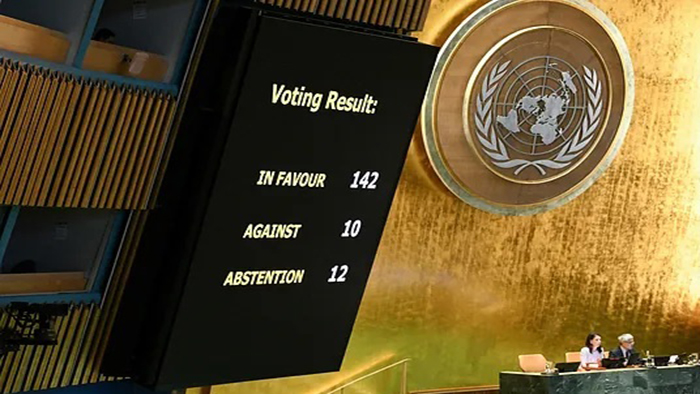 La Asamblea General de la ONU aprobó la Declaración de Nueva York, que respalda la creación de dos Estados, Israel y Palestina, de acuerdo a una iniciativa que fue presentada por Francia y Arabia Saudita y consiguió sumar 142 votos a favor contra apenas una decena en contra, incluidos los de Argentina, Estados Unidos e Israel. El texto condena a Hamas y exige que esa fuerza deponga sus armas y ceda el control de la Franja de Gaza a la Autoridad Palestina que, de acuerdo al proyecto, debería hacerse cargo del enclave con apoyo de la comunidad internacional.