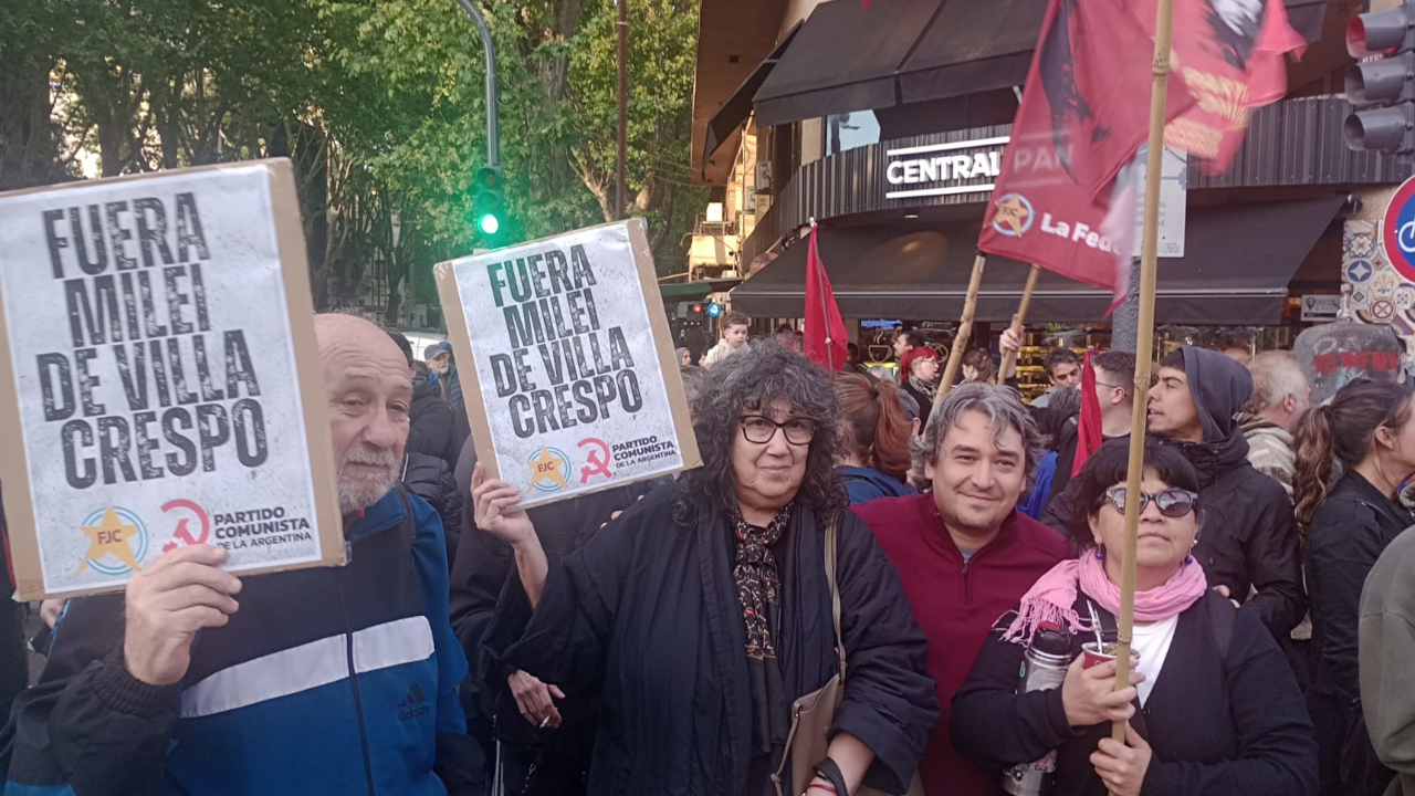 En este marco, el PC de CABA se hizo presente con un nutrido grupo de militantes encabezados por su secretario político y candidato a senador, Ariel Elger, y por Liliana Fresco, militante del MJL y candidata a diputada, así como también por los postulantes a diputados nacionales de la Comuna 15 Dardo Prusak, María Luisa León y Hugo Mir. Lxs comunistas de la Ciudad coparon con sus banderas y pancartas con la consigna “Fuera Milei de Villa Crespo” la manifestación de repudio a este acto, junto a organizaciones políticas del movimiento popular y a cientos de vecinos indignados.
