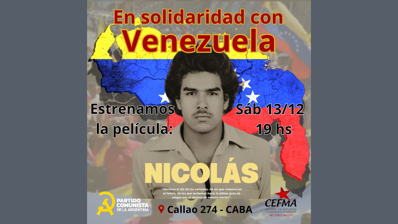 Mañana a las 19 en el CEFMA, Callao 274, se estrena esta película en la que, en primera persona, el presidente venezolano narra sus primeros pasos en la política.  “Es un acto solidario con Maduro, su pueblo y la Revolución Bolivariana cuando recrudece la agresión de EE.UU.”, dijo Ivana Brighenti. Al respecto de la escalada de ataques imperialistas, el PCA repudió el robo de un petrolero por parte de la armada yanqui en cercanías de la costa venezolana.