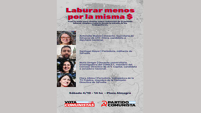 Mañana sábado, desde las 14 hs en Plaza Almagro, Ciudad de Buenos Aires, las candidatas del PC estarán conversando con los vecinos y difundiendo las propuestas políticas que la bancada comunista tiene pensado llevar al próximo Congreso. Antonella Bianco, Nuria Giniger y Clara Albisu explicaran cómo hoy, más que nunca, es posible trabajar menos con mejores sueldos.