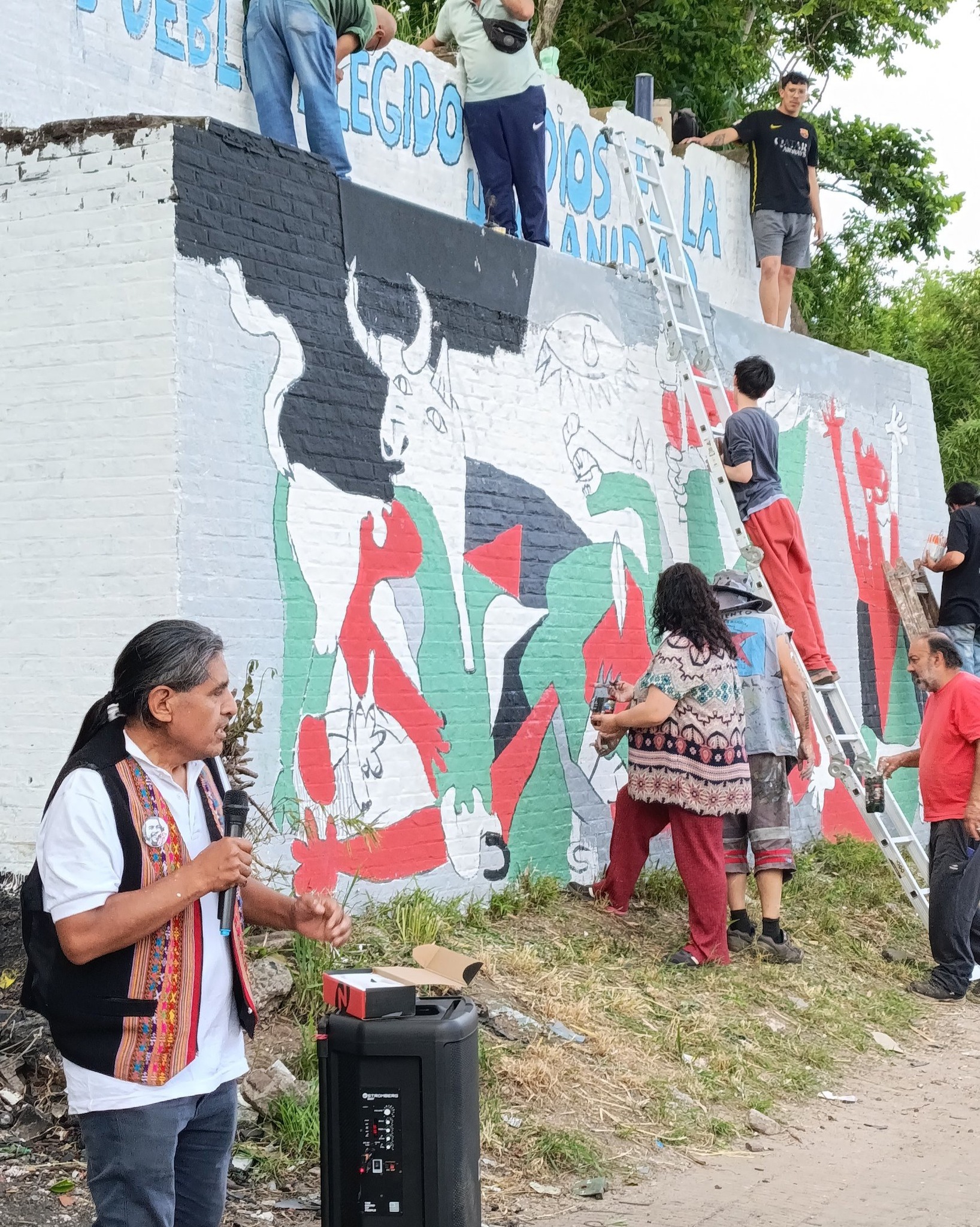 El Partido Comunista de Florencio Varela participó, junto al Movimiento Kultural, en la realización de un mural que recrea el Gernika de Pablo Picasso, atravesado por banderas y simbología palestina, al tiempo que deja en claro un mensaje de solidaridad con ese pueblo, pero también para el Estado de Israel ya que en la parte superior se puede leer la frase “El pueblo elegido de Dios es la humanidad”.